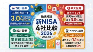 SBI証券・楽天証券・松井証券・マネックス証券の新NISAを2026年最新データで完全比較。クレカ積立還元率・投信保有ポイント・取扱銘柄数・ポイント経済圏・おすすめタイプ別診断まで徹底解説。あなたに最適な証券会社が必ず見つかります。